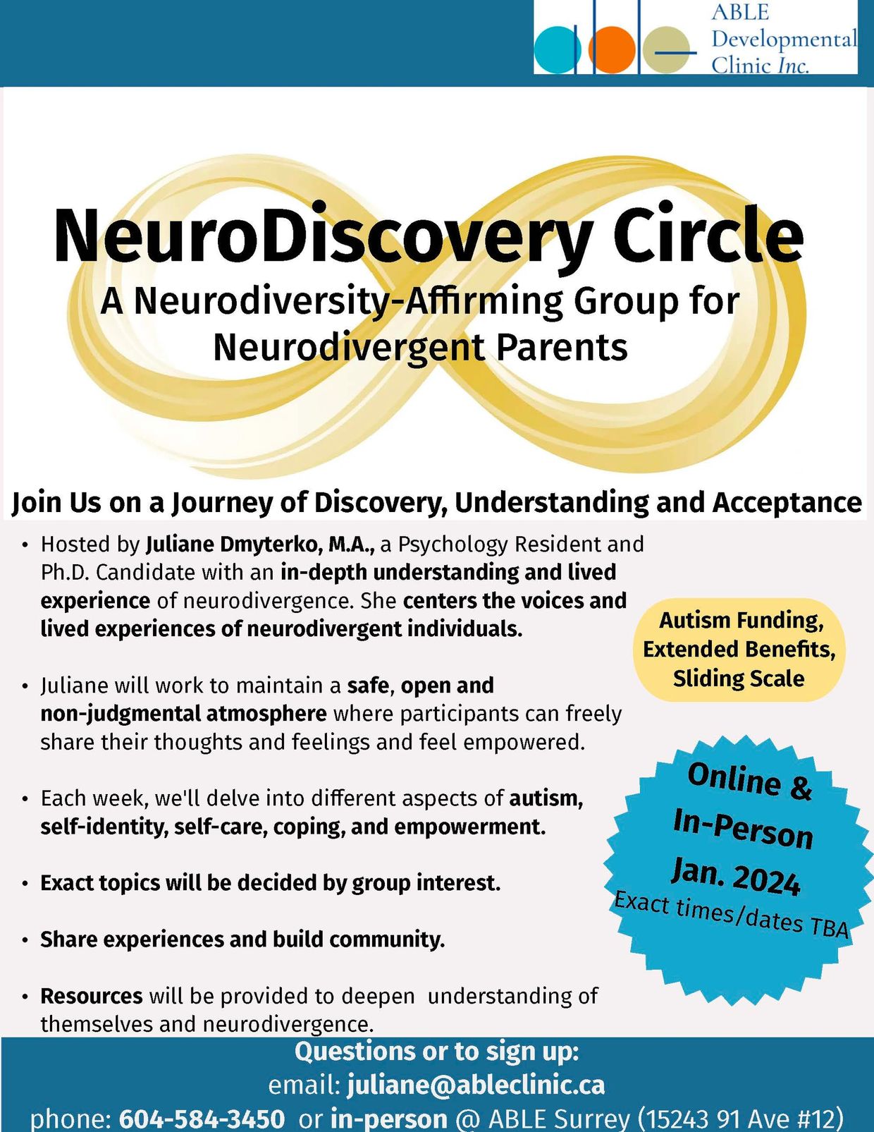 email: juliane@ableclinic.ca phone: 604.584.3450 in person: ABLE Surrey (15243 91 AVE #12)